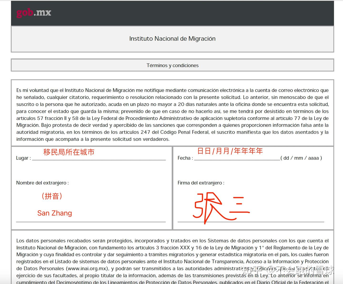 最后一页需要在移民局现场签字(Firma)。签字必须和护照第一页签字一致。在墨西哥,所有的移民手续的签字,都必须和护照第一页一致。