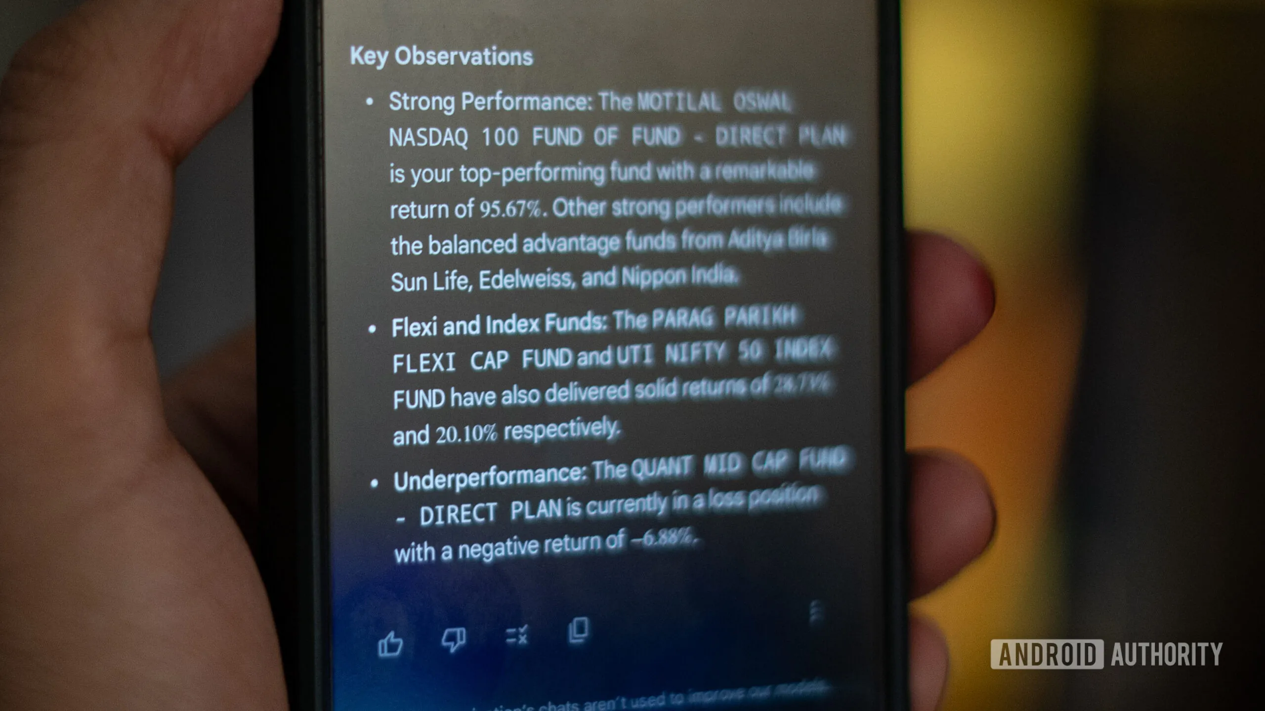 But, by and large, I’d have likely achieved the same outcome if I spent a sufficient amount of time researching the funds on my own. What Gemini did was accelerate the process dramatically. What would’ve taken me a weekend or more, it pulled off in minutes. Not just that, it was able to identify gaps that I, as a non-professional, wouldn’t have thought of. That said, Gemini is still limited by the data you feed it and its training cutoff, and it doesn’t have access to real-time mutual fund performance. It’s not a financial advisor and you shouldn’t treat it as one outside of trying to make sense of your portfolio.