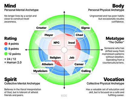 Incel → Chad → Sigma or Beta Male → Alpha Male → Sigma Male in the Body quadrant are common archetypes we see in today's world that you can observe in one's behavior and appearance. This can correspond with other areas on the graph or have further causes within the same quadrant. Like how an Incel typically has higher estrogen levels from diet and environment, and how social structures in the Vocation quadrant have led to processed food and microplastics, which further exacerbate that problem on a mass scale.