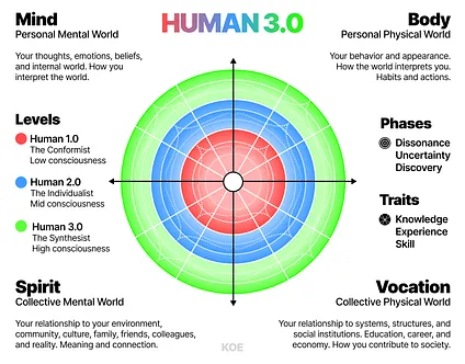 - Human 3.0 (The Synthesist) – Able to adopt multiple perspectives, connect various patterns of reality, and strategize new paths. They understand that all perspectives hold truths that can be synthesized for more holistic and mutually beneficial results. They can display what some may perceive as level 1 traits, such as narrow-mindedness, but it is an intentional choice to tune out noise.